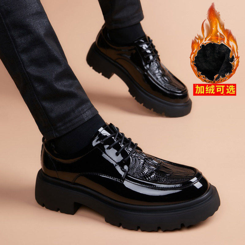 皮鞋男款2025冬季新款真皮商务正装休闲加绒鳄鱼纹英伦厚底增高鞋