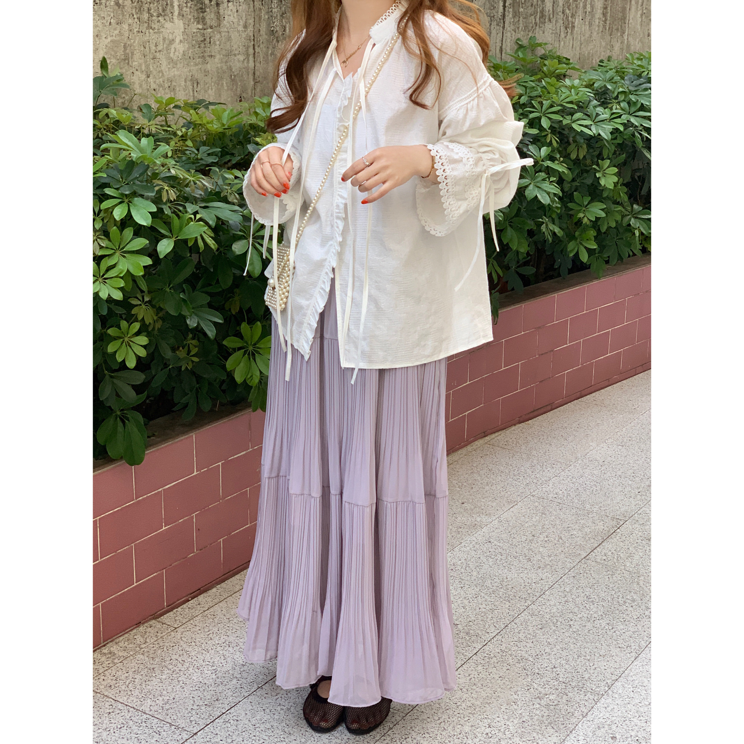 法式复古木耳边系带喇叭袖宽松气质纯色衬衫微透女薄款长袖上衣女