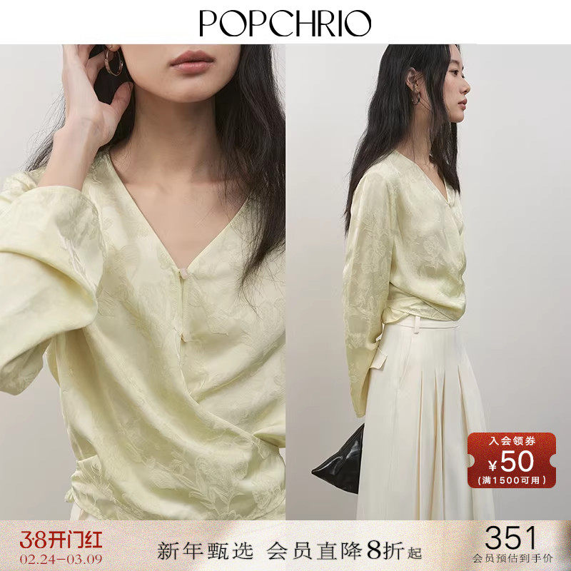 POPCHRIO欧可芮◆围裹系带V领提花缎面衬衫喇叭长袖收腰衬衣女春