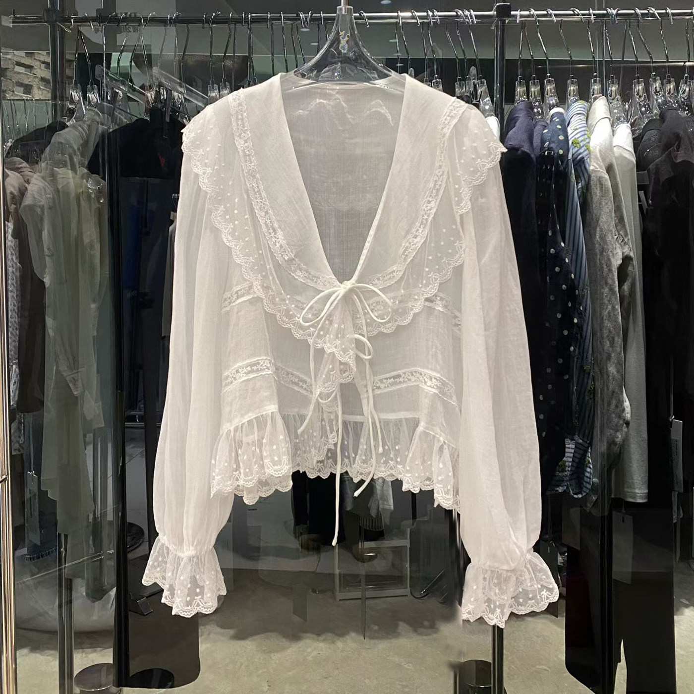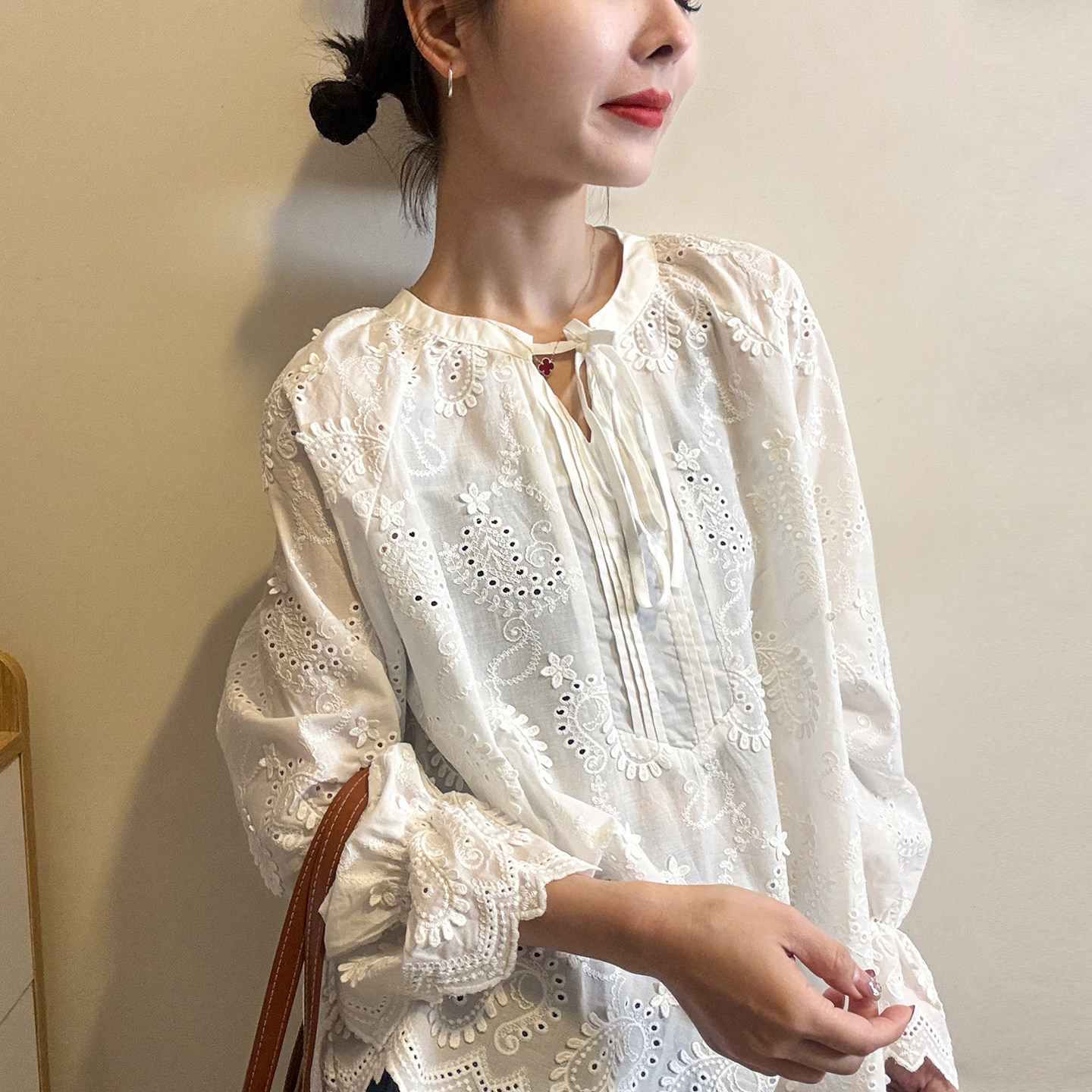 韩国chic春季洋气蝴蝶结系带刺绣蕾丝钩花宽松喇叭袖衬衫上衣女