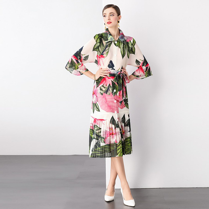 褶皱喇叭袖印花翻领衬衫裙子2026春秋宽松大码系带荷叶边连衣裙女