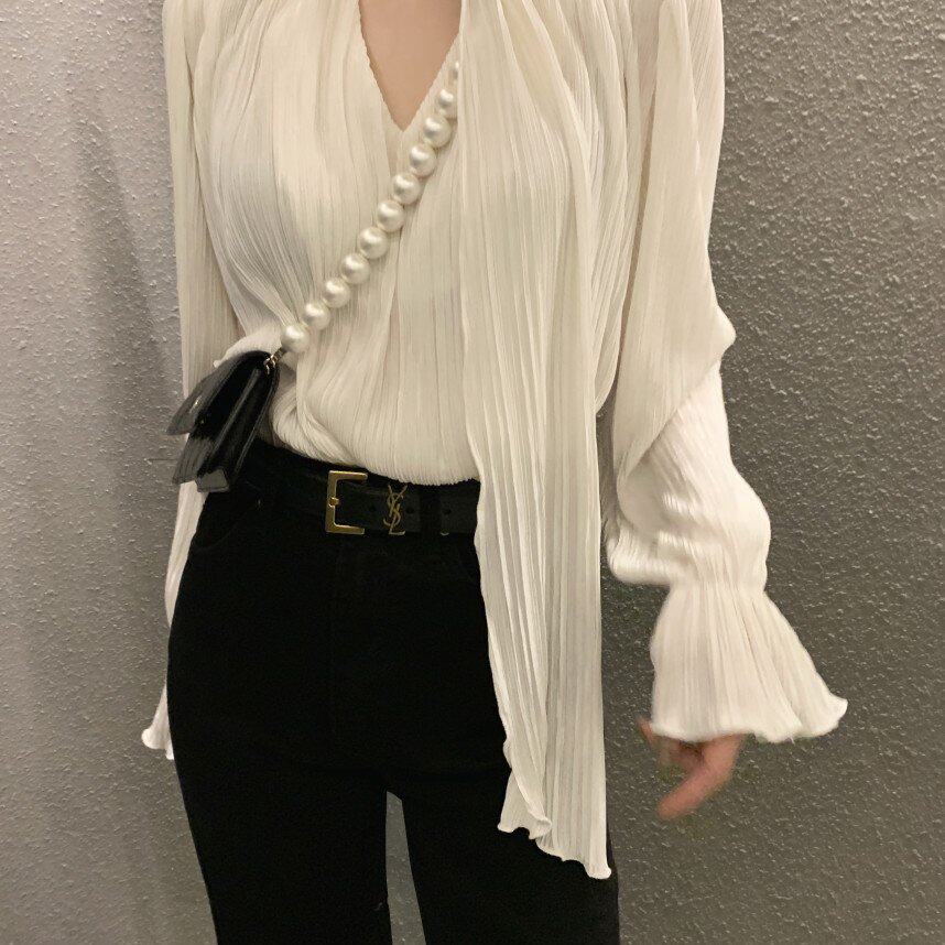 已出货 韩国 chic 小众设计感 褶皱系带 喇叭袖 衬衫上衣