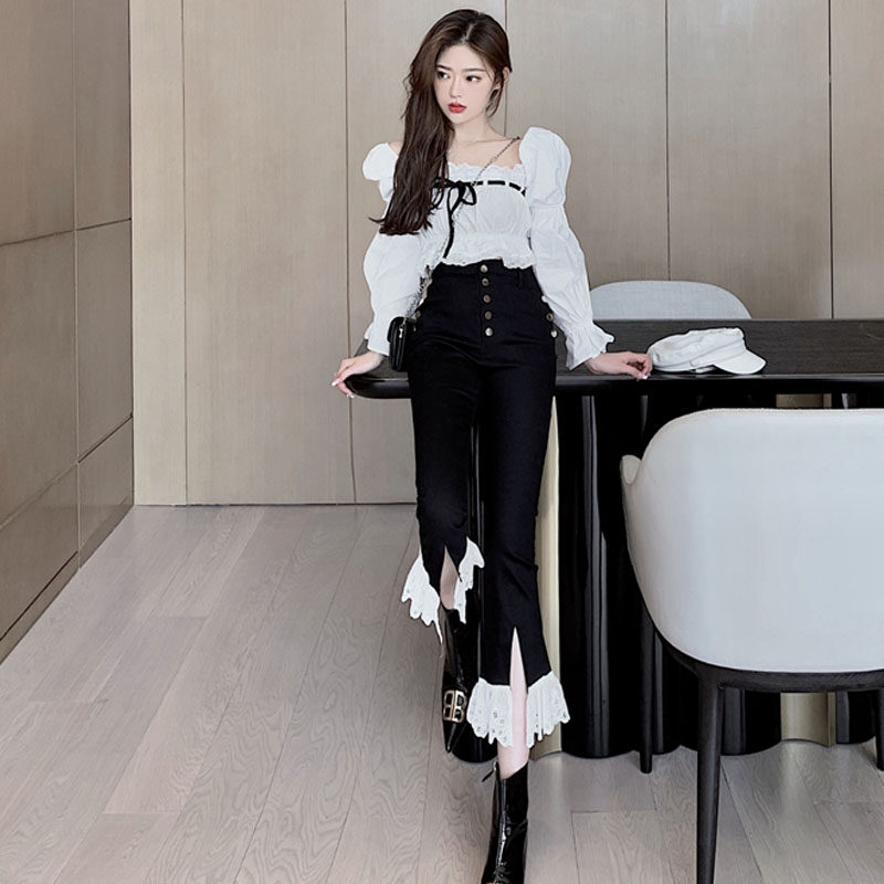 纯欲仙女套装秋季新款方领泡泡袖系带甜美衬衫+高腰花边喇叭长裤