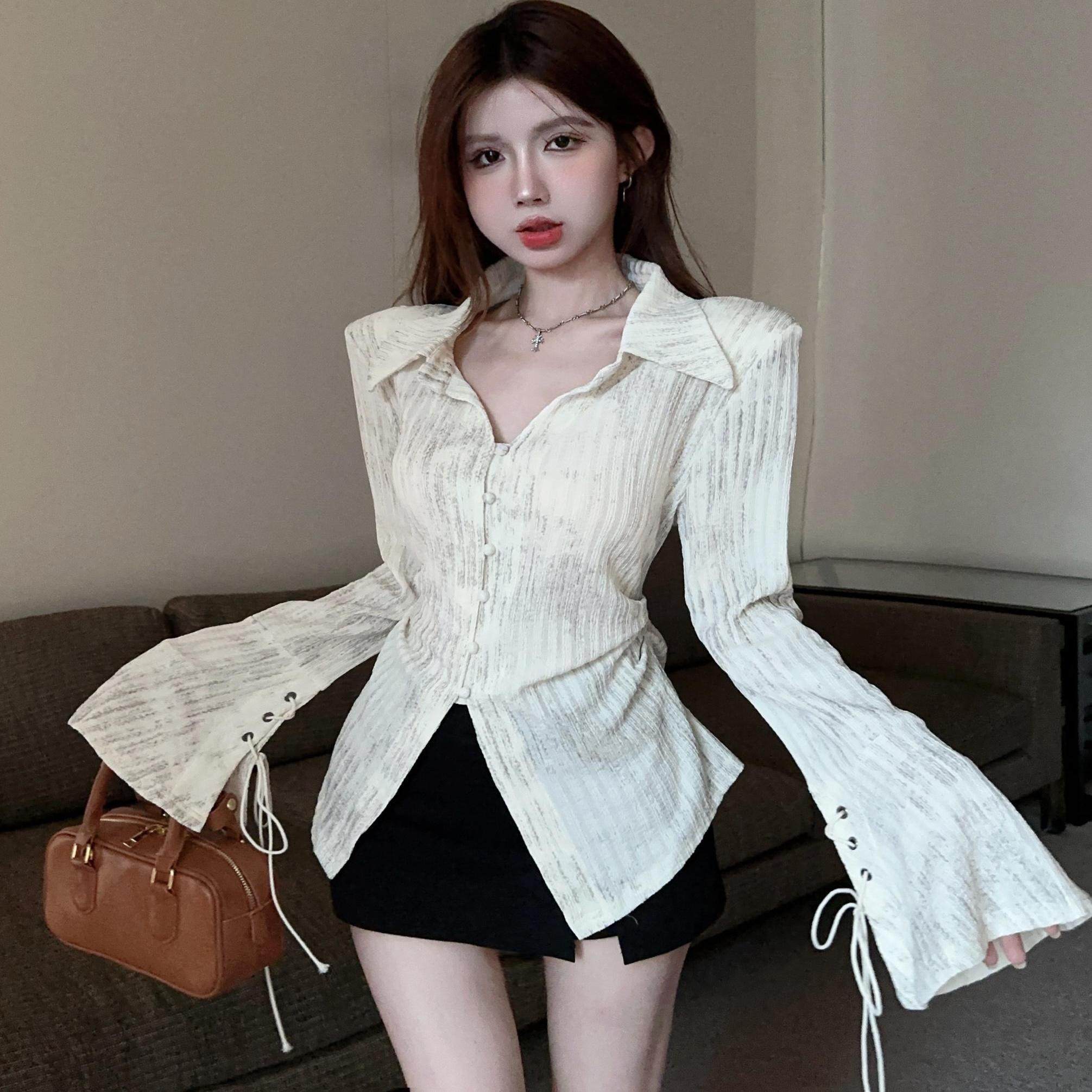 美式y2k扎染衬衫女秋冬设计感小众系带喇叭袖纯欲收腰显瘦v领衬衣