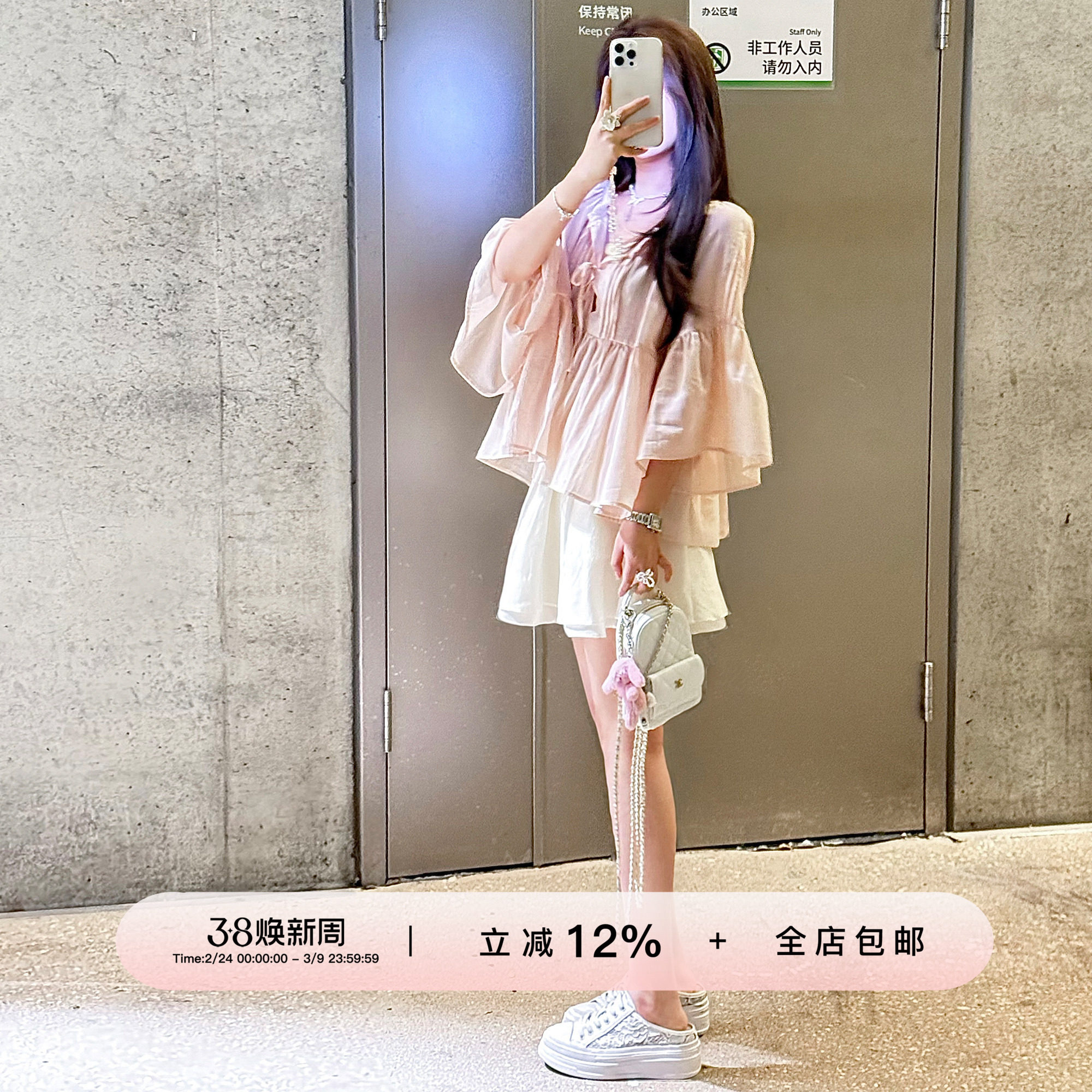 韩国ins秋季甜美气质交叉V领系带收腰双层荷叶边喇叭袖防晒衬衫女