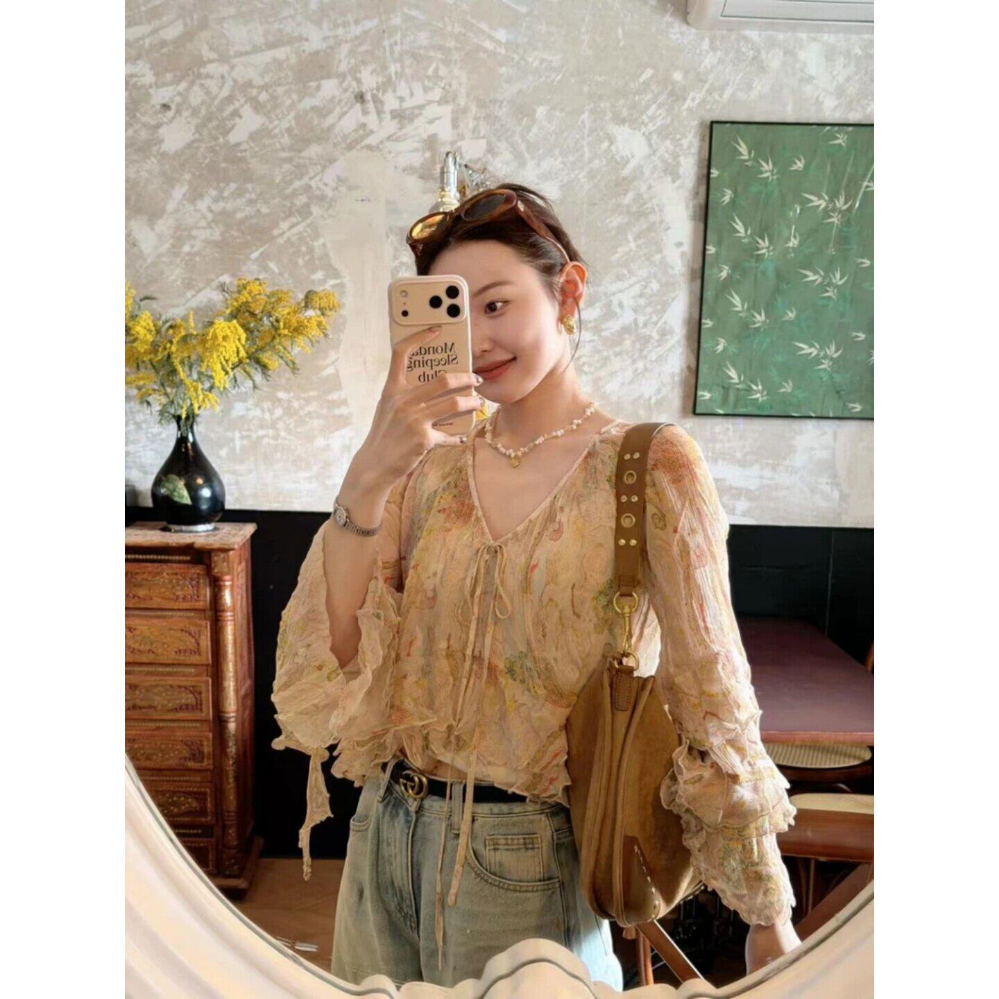 一整套ootd穿搭一整套系带V领喇叭袖薄款衬衫上衣复古宽松牛仔裤