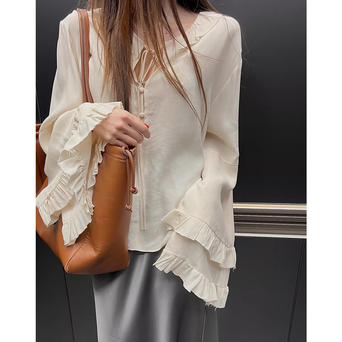 法式设计感不规则喇叭袖缎面显瘦衬衫女荷叶边V领系带防晒上衣潮
