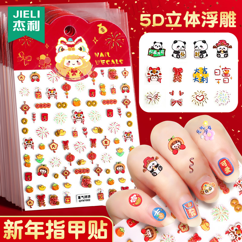 杰利5D浮雕儿童指甲贴女孩卡通可爱装饰贴立体贴纸2026新年美甲贴自粘安全无味过年短款指甲贴小朋友小号可爱