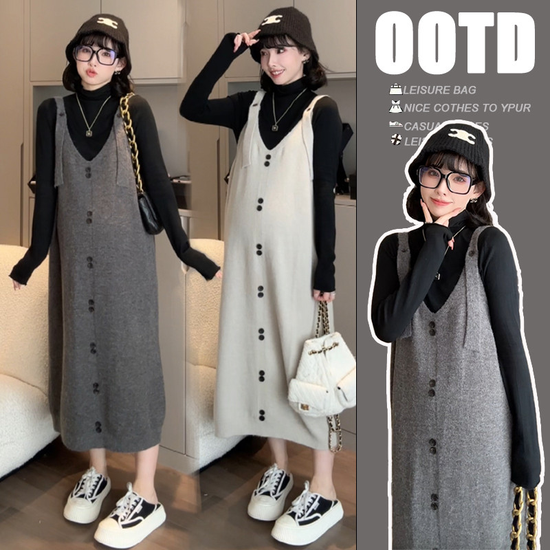 2024新款时尚孕妇连衣裙套装春秋秋冬大码针织毛衣背带裙两件套女