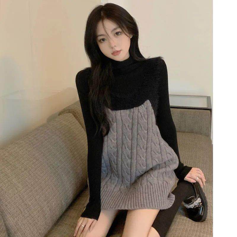 阔色假两件针织毛衣背带裙长袖连衣裙女2025秋冬季新穿搭长裙子春