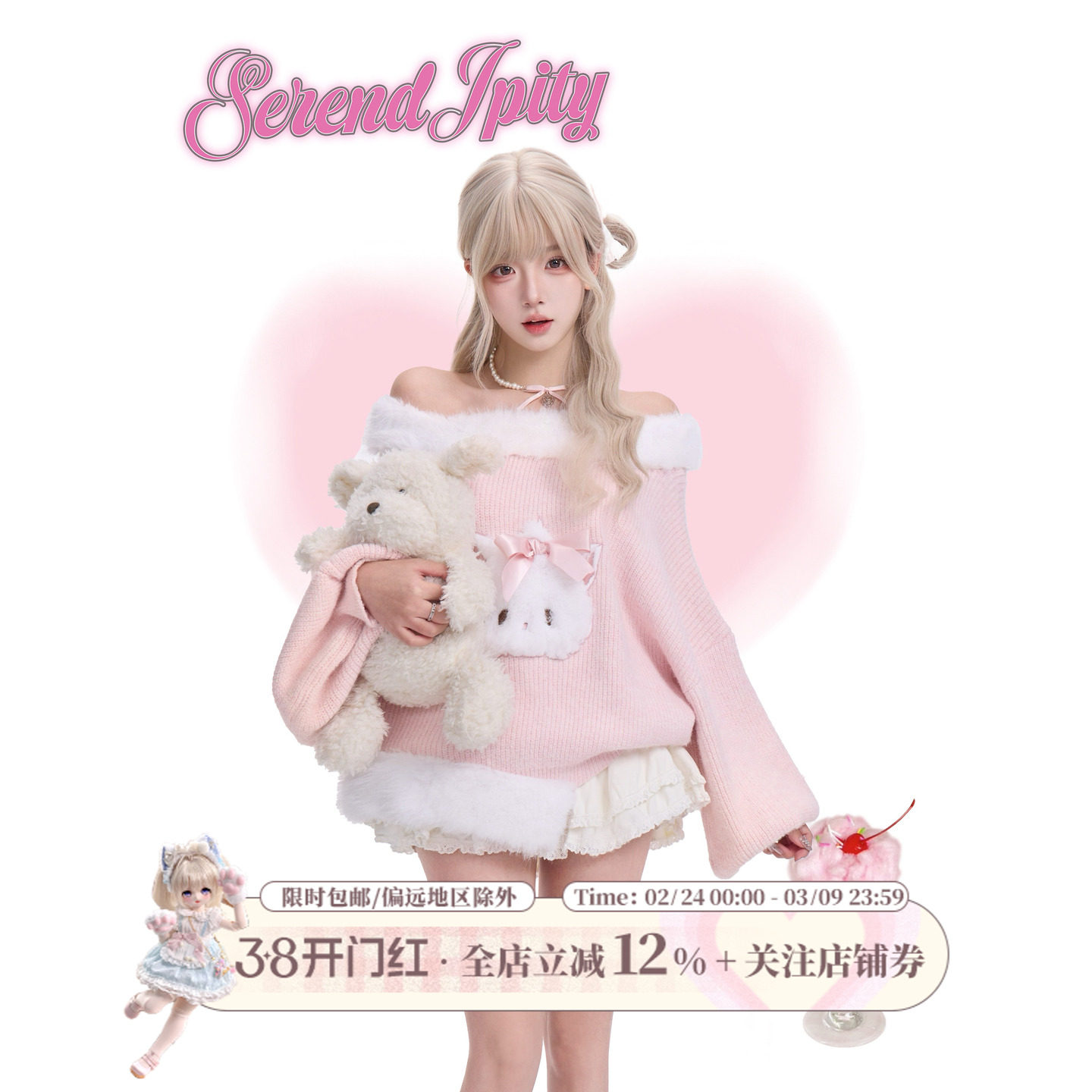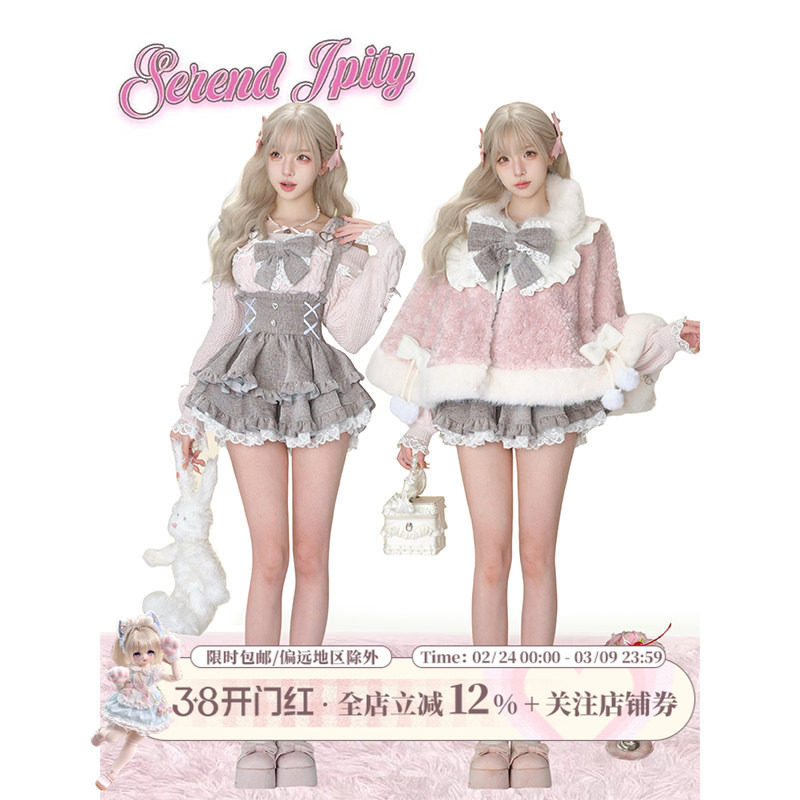 【蕾丝系】粉叽人偶 粉色毛绒斗篷+一字肩毛衣+小个子背带蛋糕裙