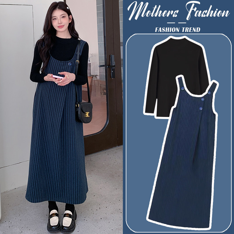 孕妇连衣裙套装秋冬韩版法式毛呢条纹背带裙毛衣2024新款两件套女