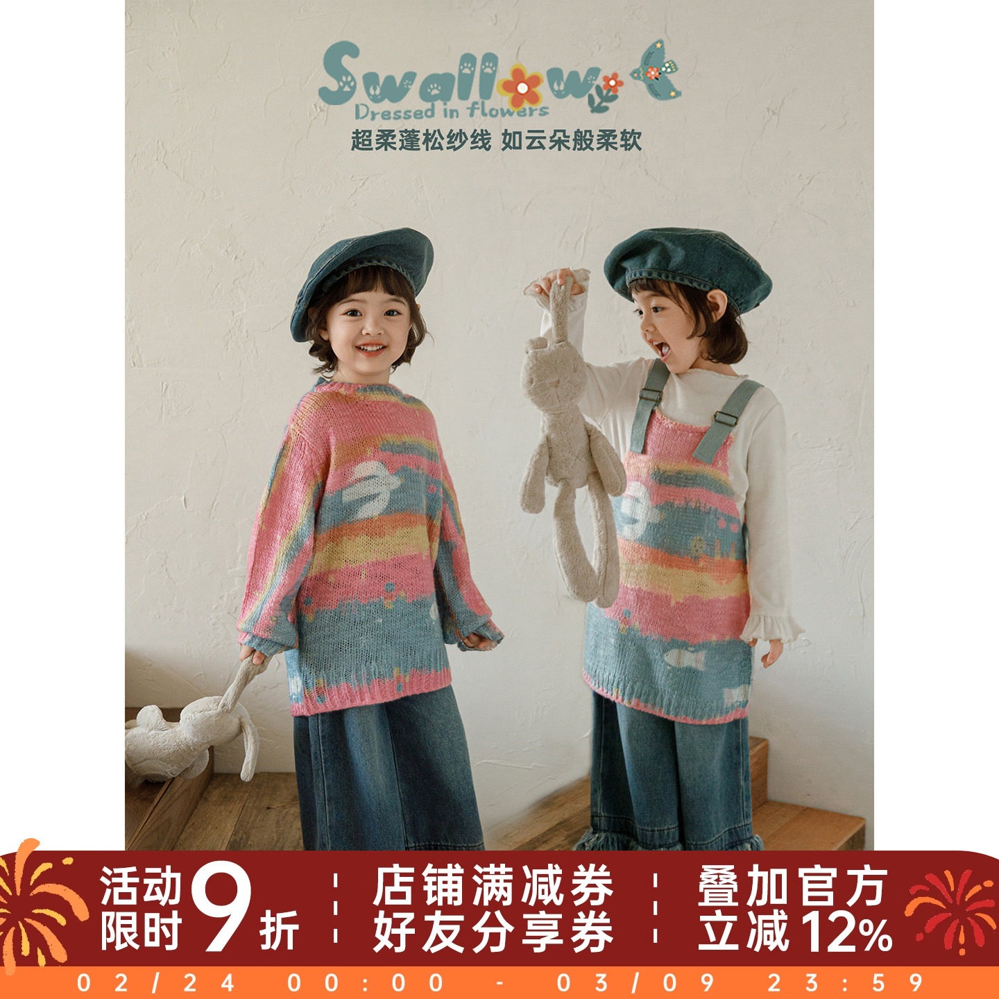 幼悠女童2026春季新款长袖圆领渐变涂鸦毛衣宽松甜美背带裙套装潮