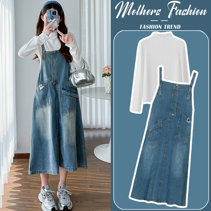 孕妇连衣裙套装2024新款春秋毛衣牛仔背带裙宽松休闲显瘦两件套女