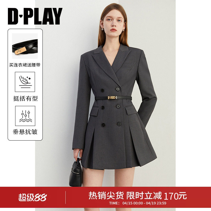 DPLAY灰色西装连衣裙女收腰气质长袖2026春季新款通勤西装外套