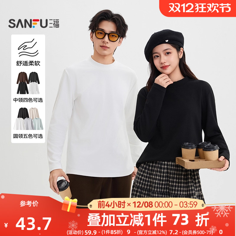三福2025冬季新款长袖T恤男圆领纯色情侣德绒保暖修身中领打底衫