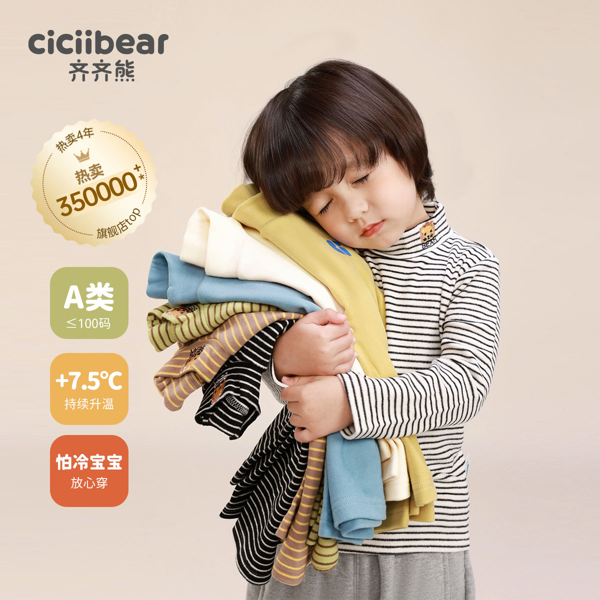 [发热]齐齐熊男童打底衫冬款宝宝条纹儿童半高领T恤童装女童纯色