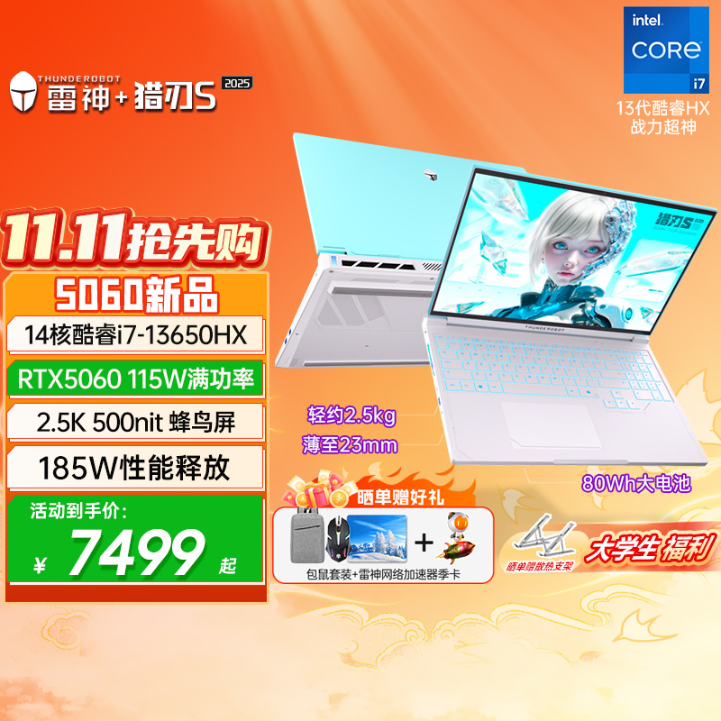 雷神猎刃S天青色英特尔酷睿i7HX满血5060电竞游戏本16英寸大学生便携设计编程笔记本电脑