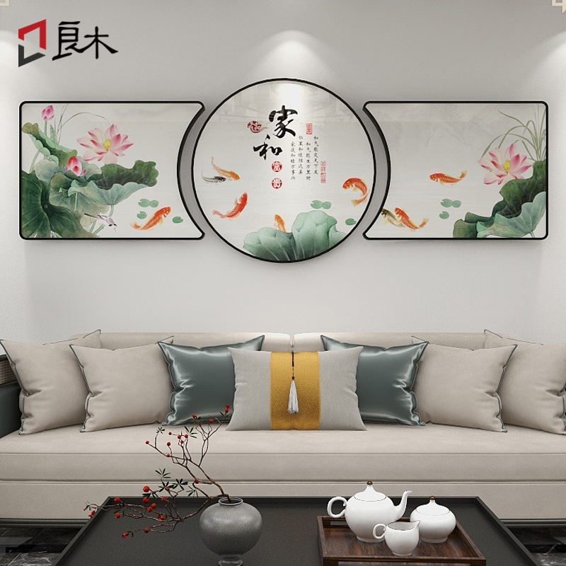 客厅装饰画家和万事兴挂画新中式沙发背景墙画九鱼图荷花三联壁画