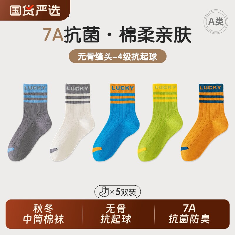 儿童袜子春秋纯棉纱线男童7A抗菌防臭袜秋冬款A类运动无骨袜中筒