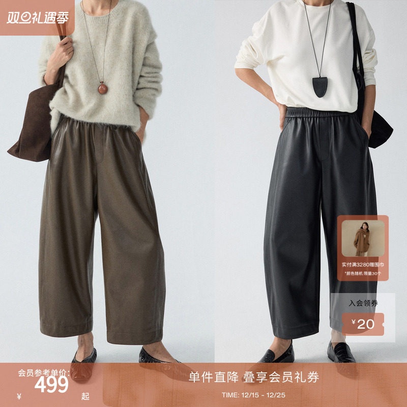 RUISHI芮时 “人生皮裤”橡筋腰宽松蛋白皮九分pu皮裤阔腿裤女冬