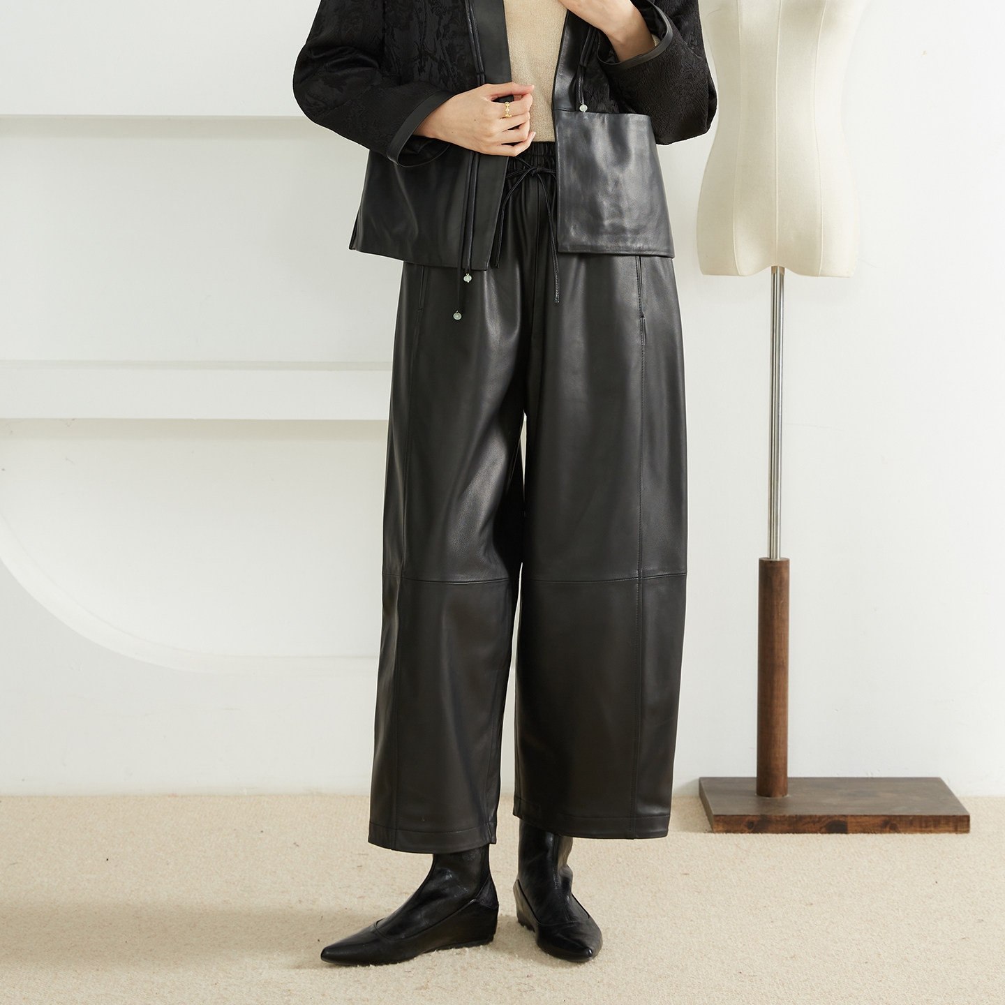 一丝牵100%绵羊皮真皮皮裤女松紧腰弯刀阔腿裤高腰显瘦休闲九分裤