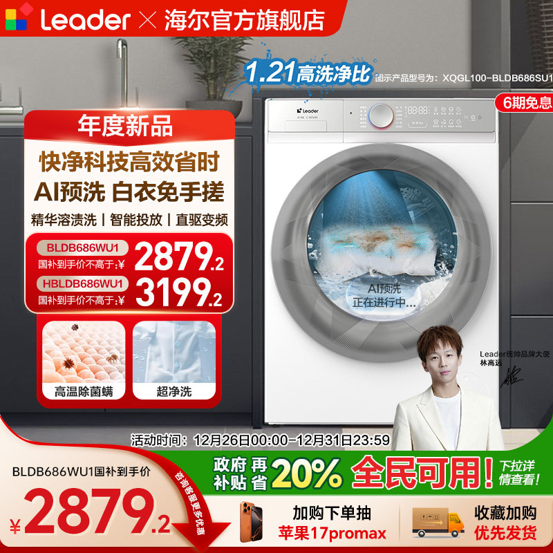 换新补贴海尔出品统帅白色嵌入式10kg懒人智能家用滚筒洗衣机686W