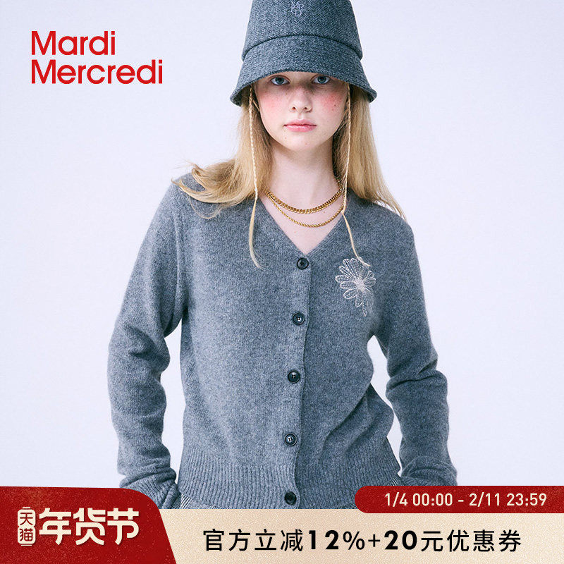 MardiMercredi小雏菊刺绣V领针织开衫绵羊毛混纺百搭气质上衣女款