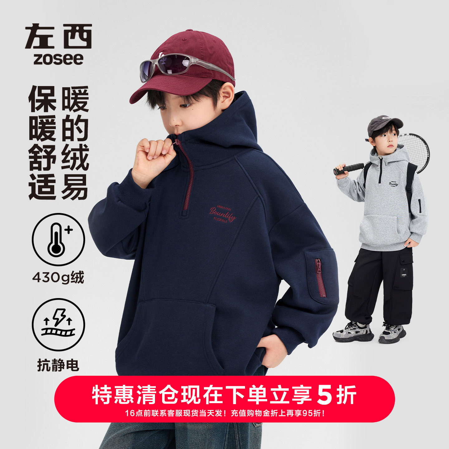 左西男童外套儿童连帽拉链卫衣2025秋冬新款男孩大童运动加绒上衣
