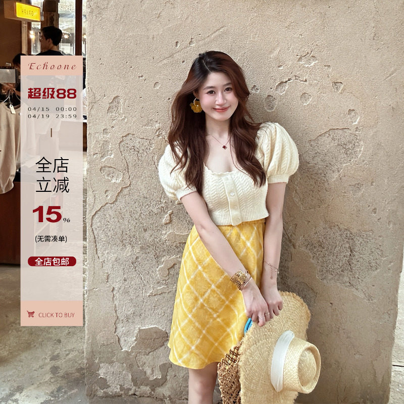 Echoone Summer Euca 春夏新款格纹亚麻短裙氛围感复古甜美半身裙