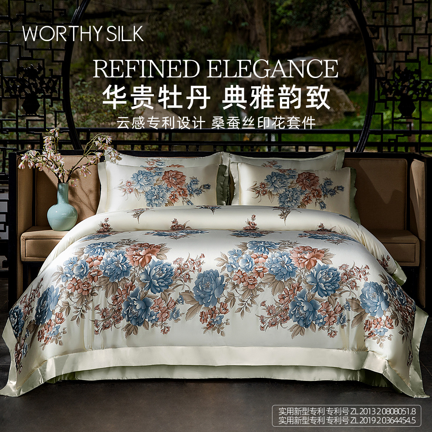 华氏蚕人重磅印花真丝四件套轻奢新中式双面100%桑蚕丝绸床品套件