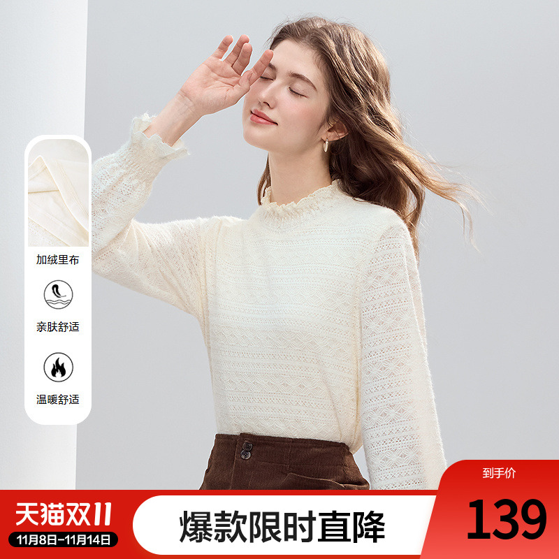 betu百图法式木耳边加绒衬衫女2025年冬季新款半高领衬衣打底衫