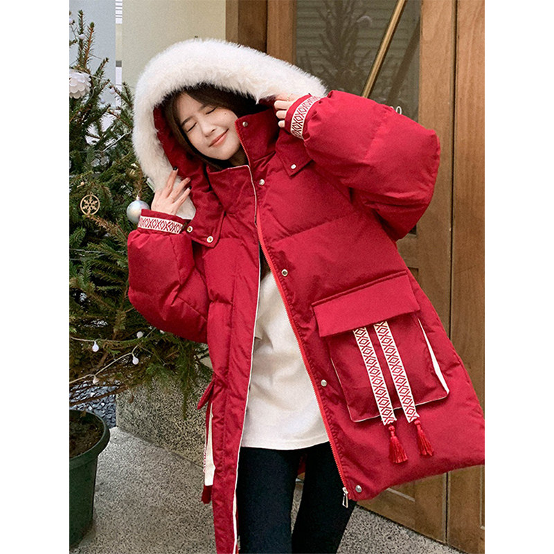 大码女装大毛领新年红棉服女胖mm新中式国风高级感甜美加厚外套女