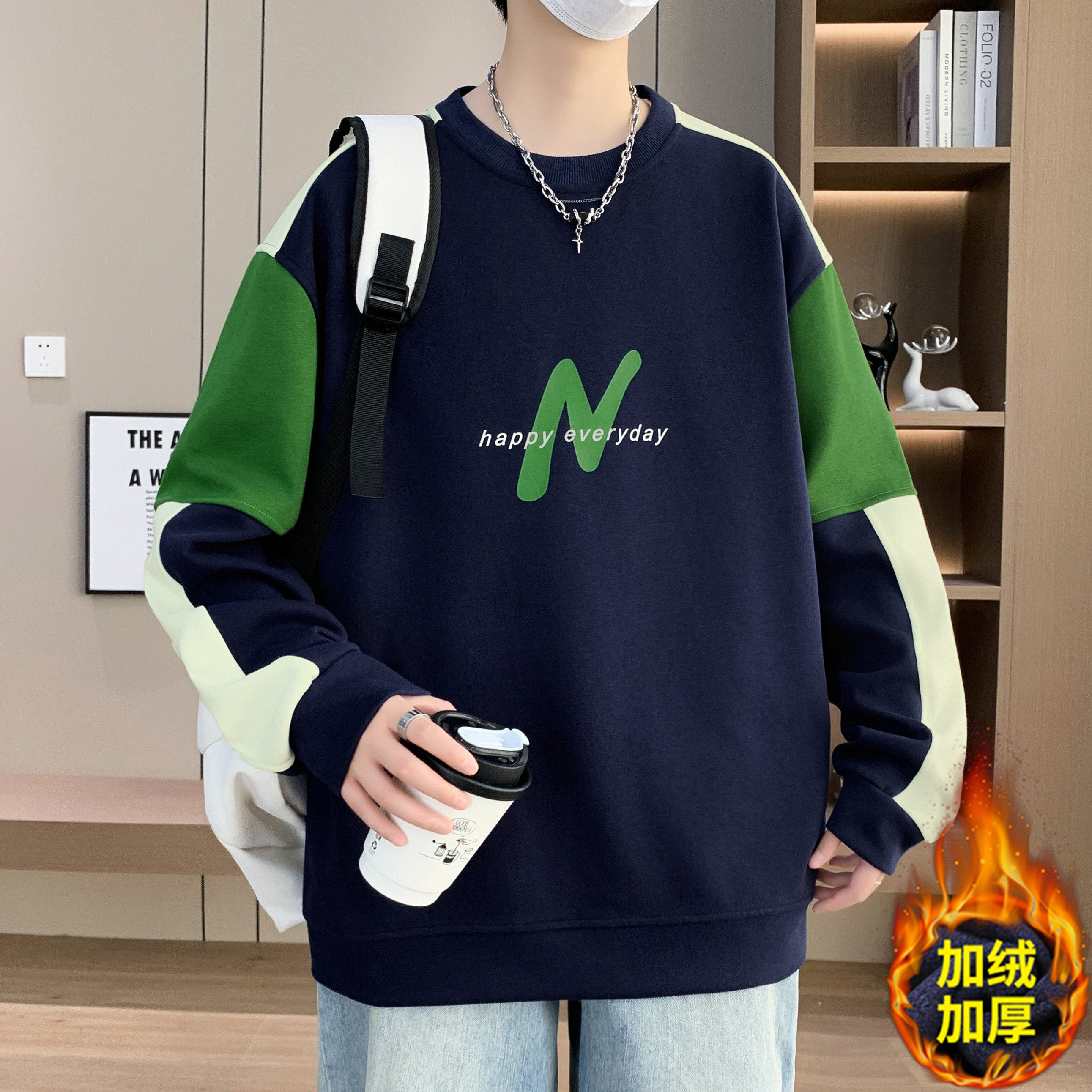 2025秋冬季新款男装卫衣帅气 青少年学生无帽加厚拼接加绒长袖t恤