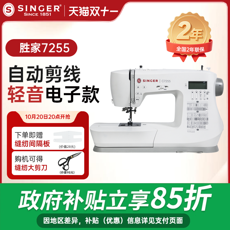 SINGER胜家7255缝纫机吃厚型电子多功能台式衣车带锁边自动剪线