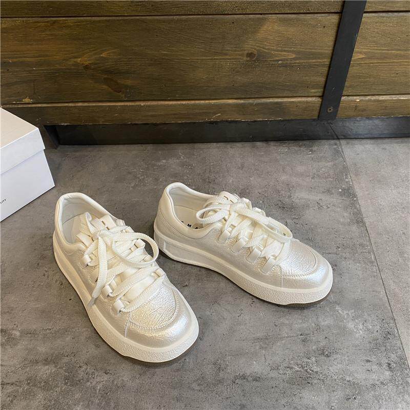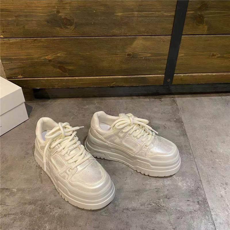 珠光白厚底板鞋女2024冬季新款百搭松糕小白鞋真皮运动休闲鞋