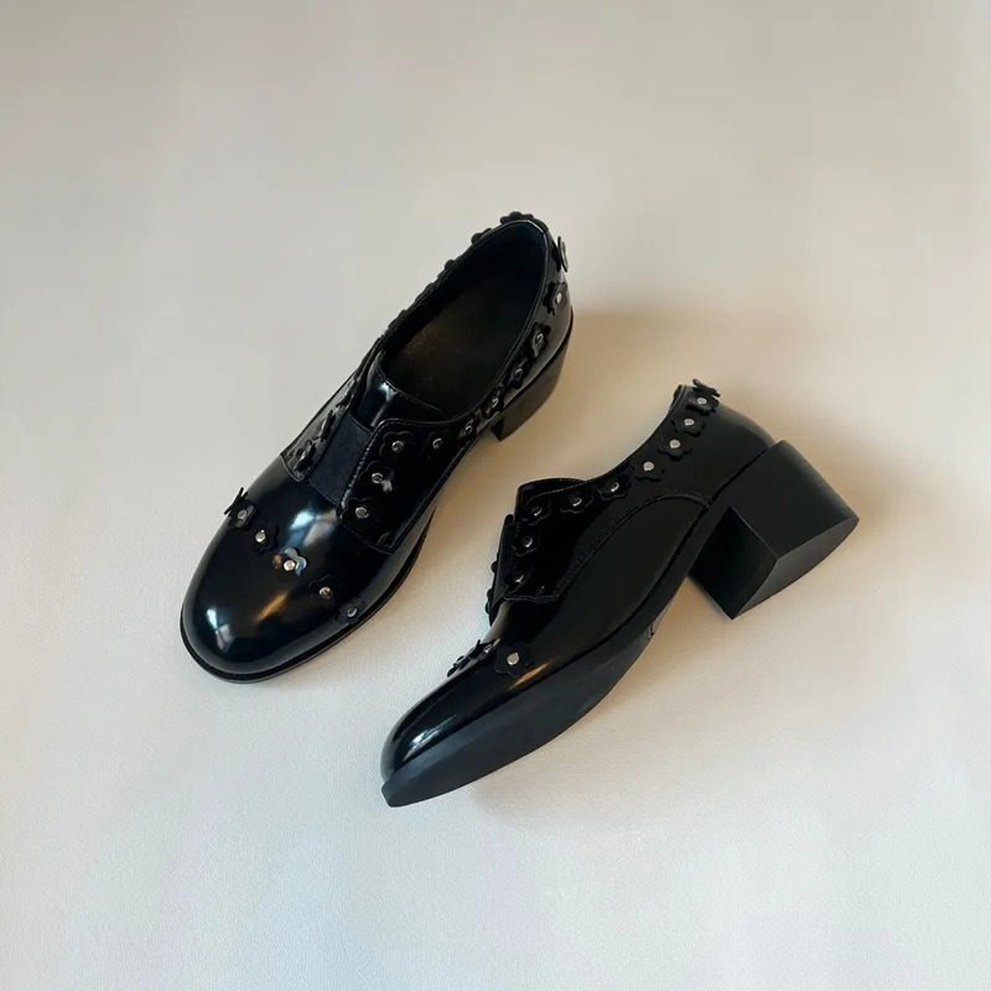 2026春季新款黑色铆钉一脚蹬小皮鞋女粗中跟圆头漆皮百搭浅口单鞋