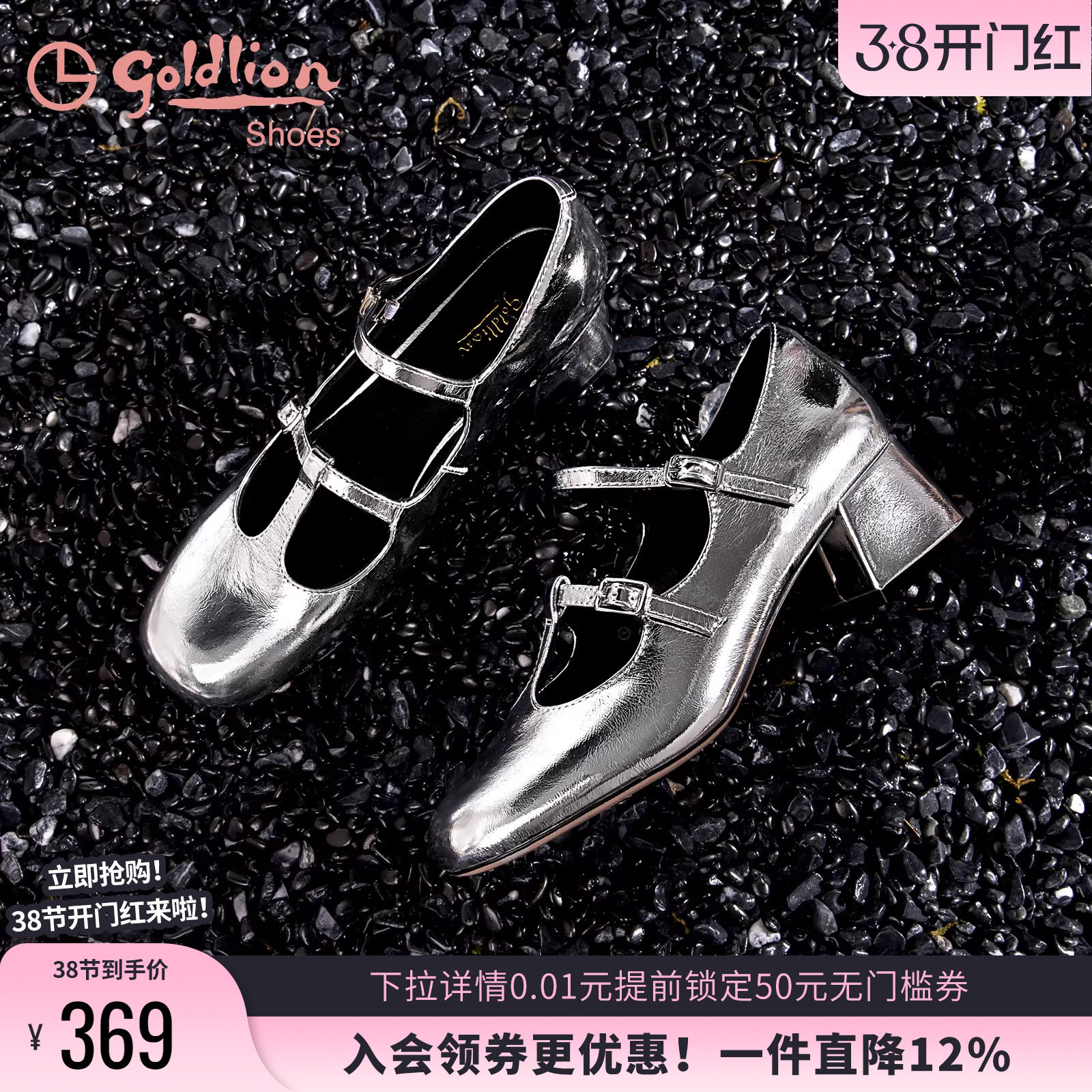 金利来银色玛丽珍鞋女中跟春季女鞋真皮圆头百搭气质浅口粗跟单鞋