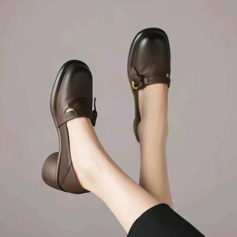 真皮复古圆头浅口粗跟单鞋女2024春秋新款百搭真皮厚底中跟小皮鞋
