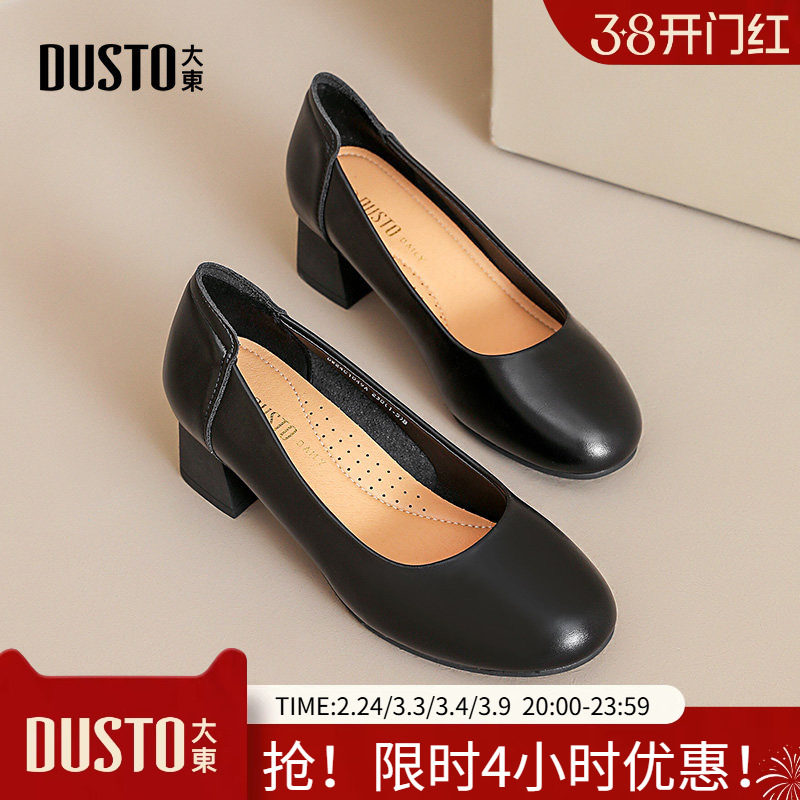 大东妞真皮单鞋女士粗跟中跟春季新款简约百搭圆头浅口套脚高跟鞋