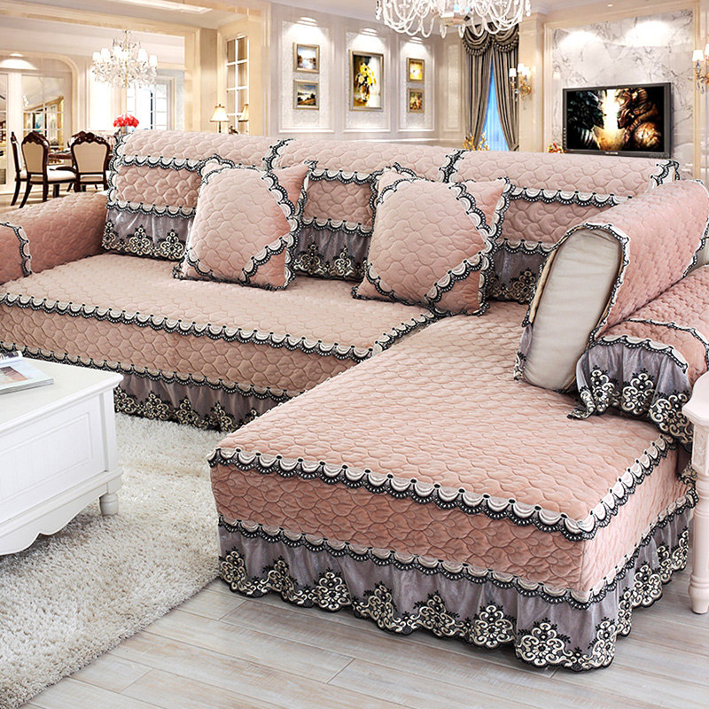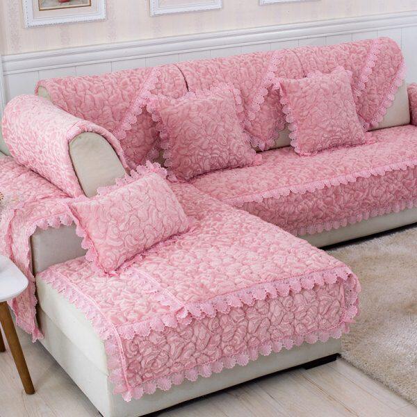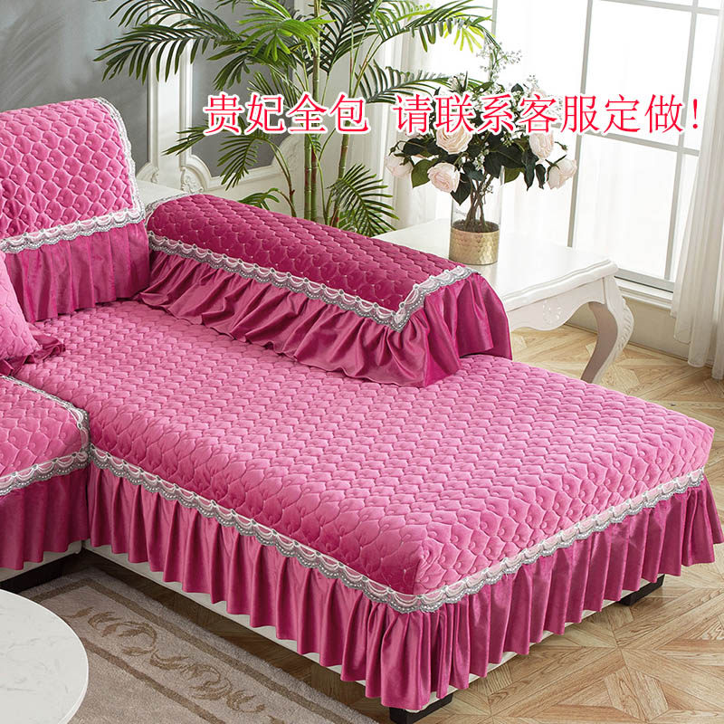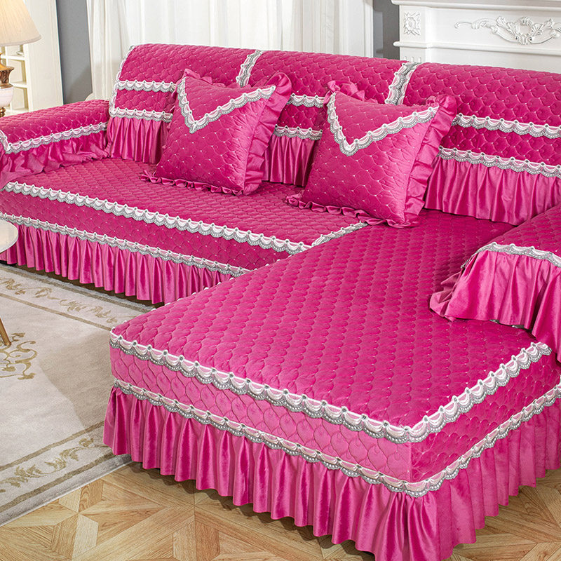简约现代冬季毛绒法兰绒沙发垫布艺欧式花边贵妃全包定做套巾玫红