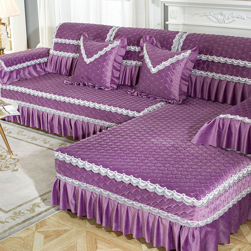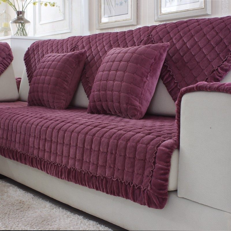 冬季加厚毛绒沙发垫布艺防滑水晶绒法兰绒欧式现代皮防滑套巾紫色