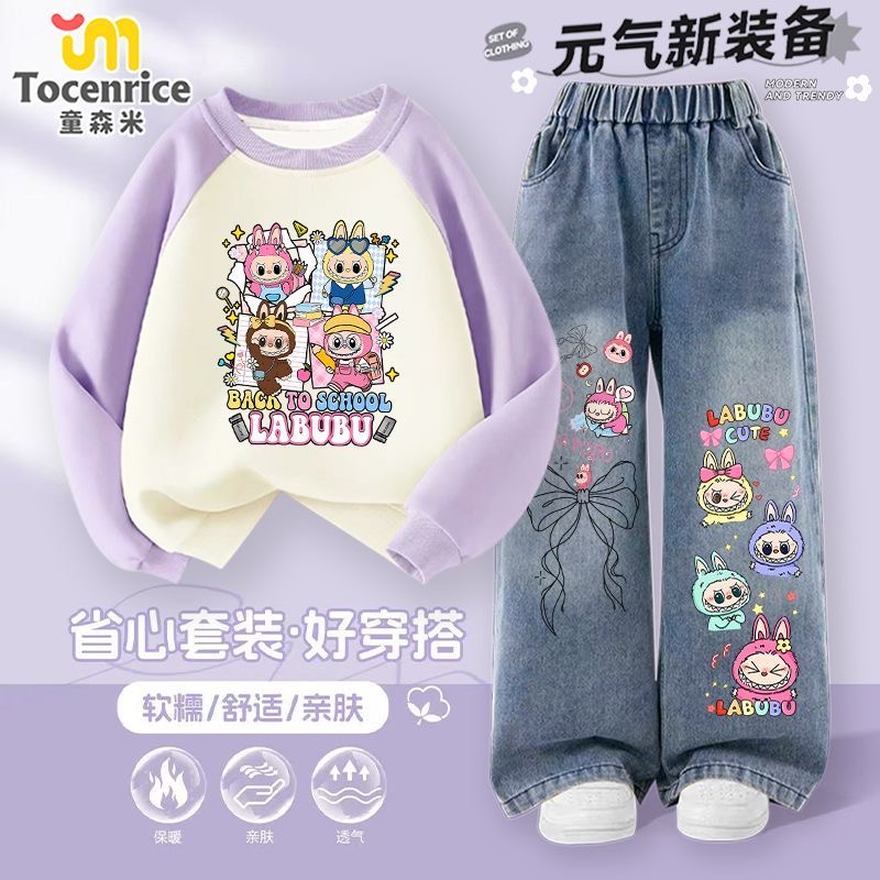 拉布布儿童套装2025秋冬款labubu衣服卫衣直筒牛仔裤女孩两件套装