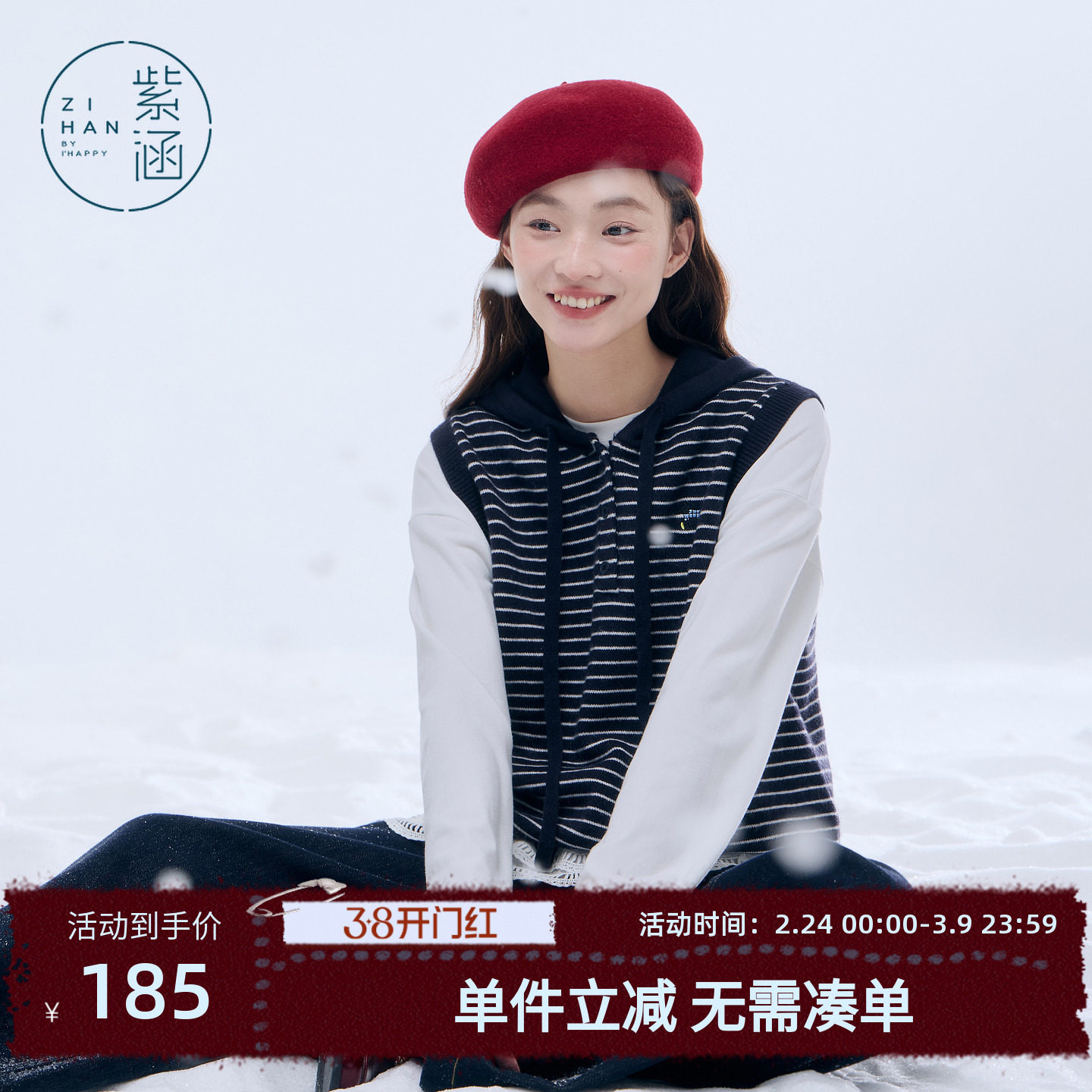紫涵连帽无袖针织马甲女2025年冬季新款撞色条纹叠穿套头马夹背心