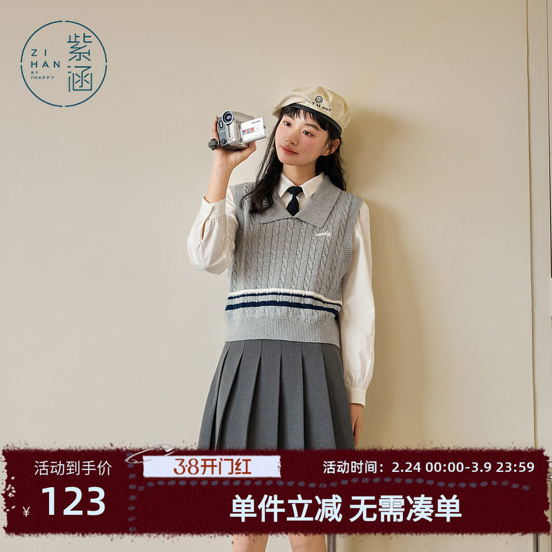 紫涵撞色条纹绞花翻领针织马甲女春秋季新款学院风刺绣叠穿背心潮