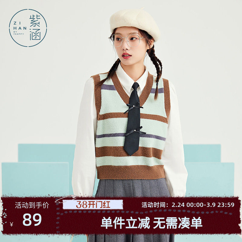 紫涵条纹拼接毛织套头马甲女装冬季新款基础百搭V领内搭马夹外套