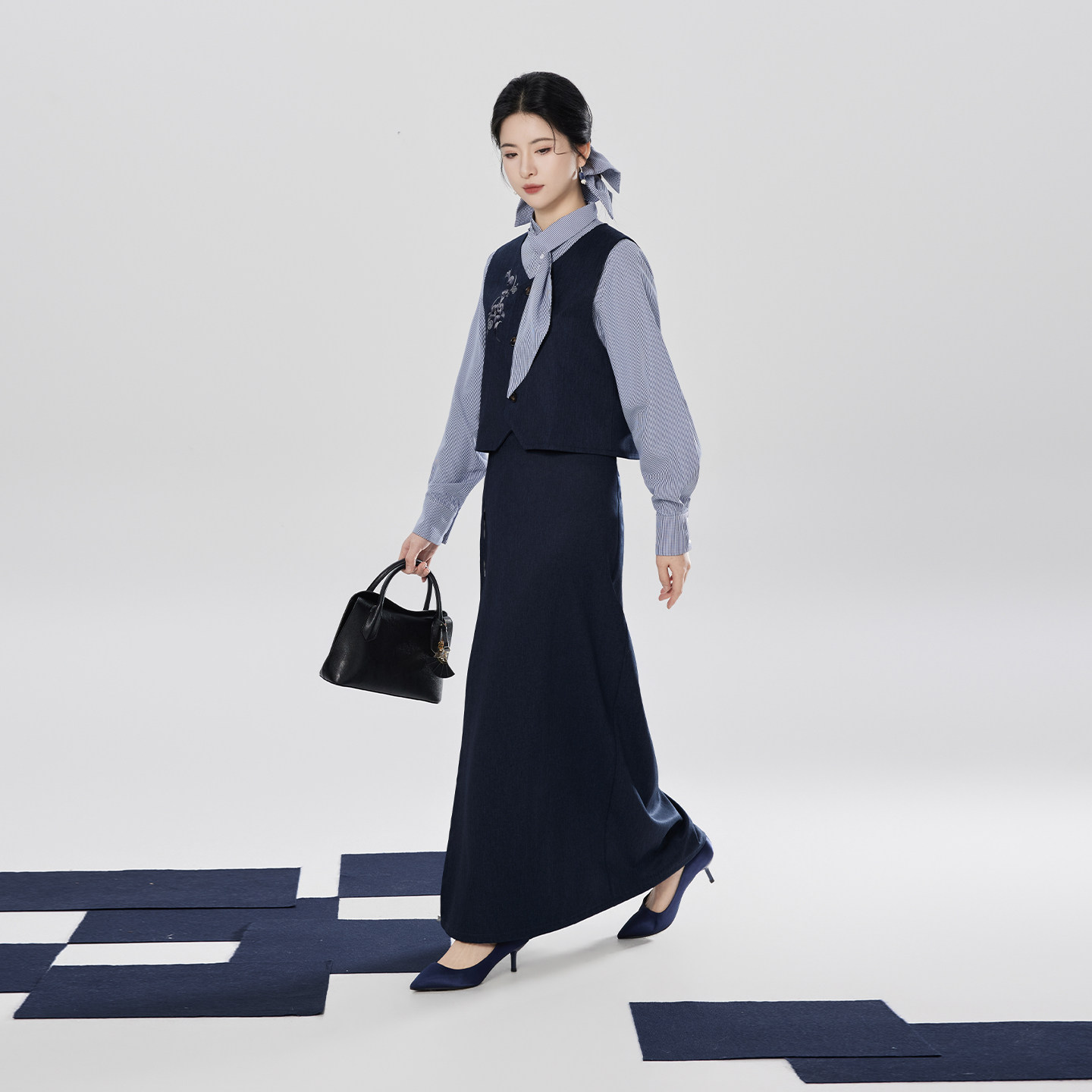 织造司[依兰]新中式马甲女条纹衬衫上衣长裙一片式宋旋裙改良汉服