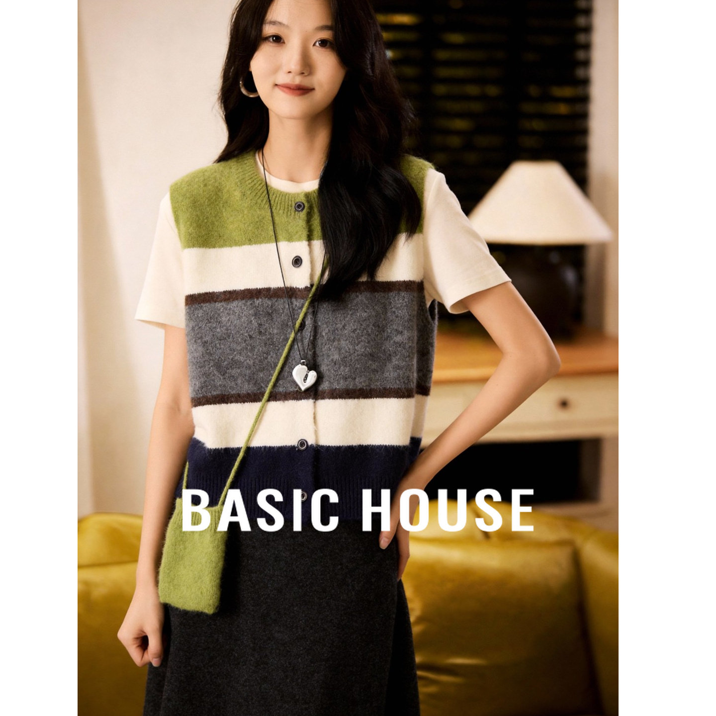 Basic House/百家好撞色条纹针织马甲女春季新款圆领无袖毛衣背心