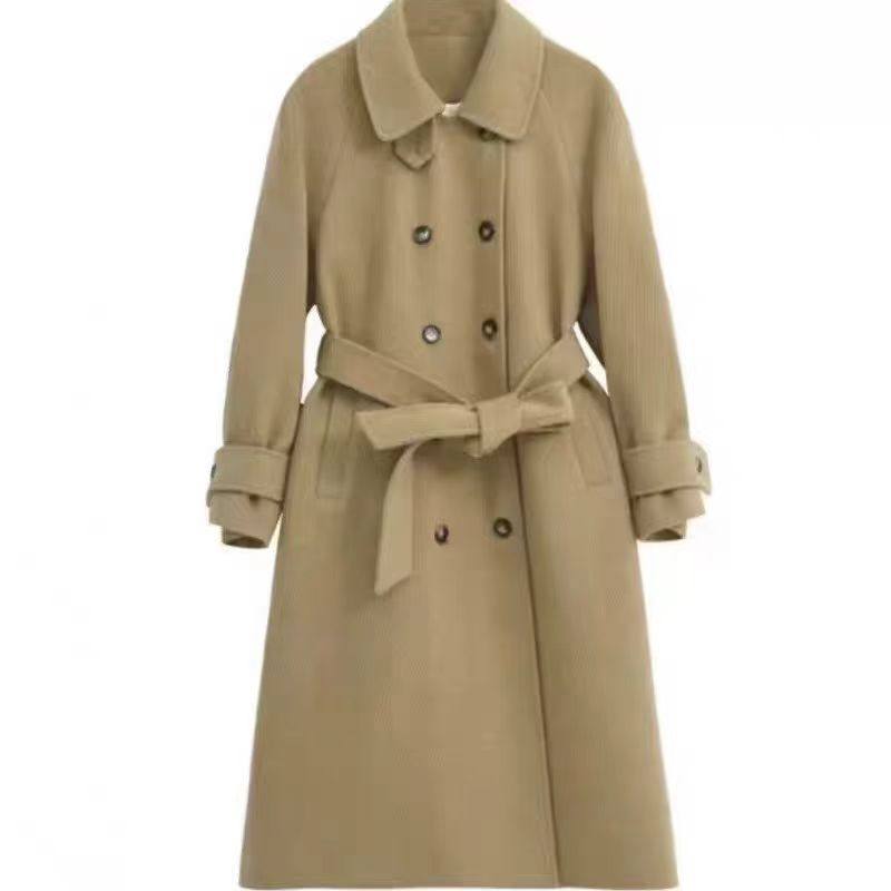韩国chic秋冬复古气质双排扣系带收腰显瘦过膝长款毛呢外套大衣女