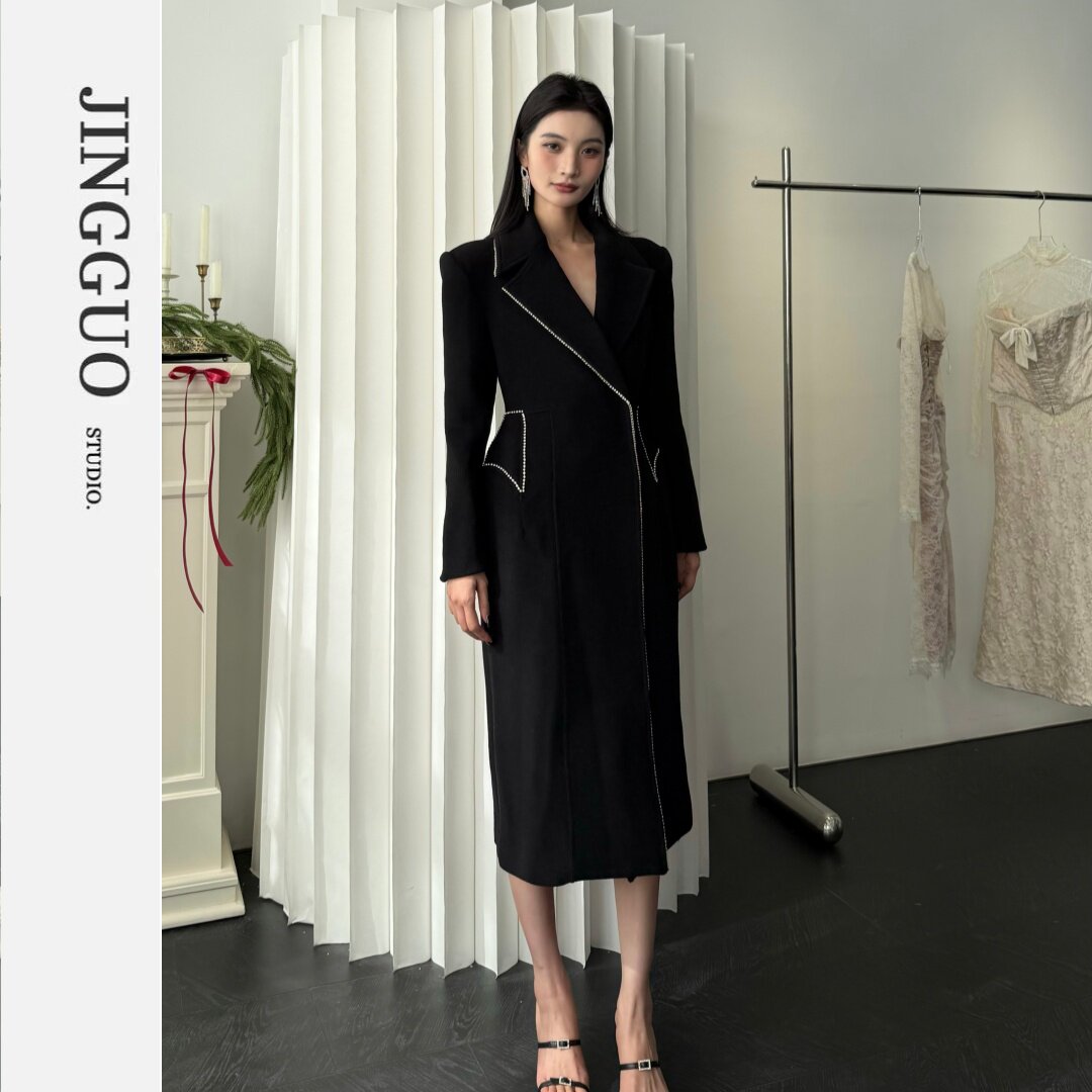 【JINGGUO轻奢】轻熟简约风毛呢大衣女长款收腰镶钻气质外套6666
